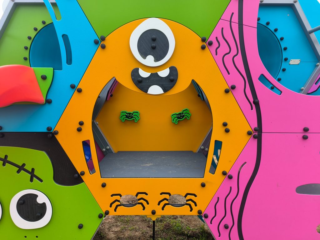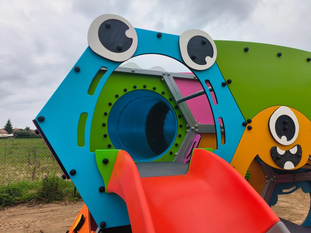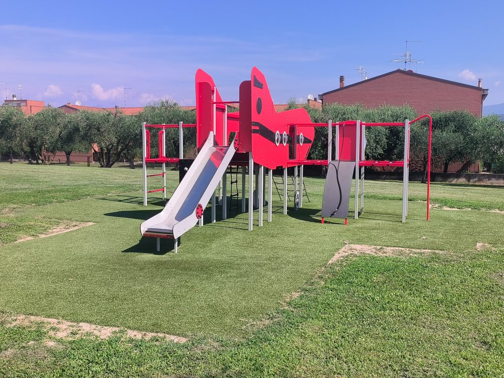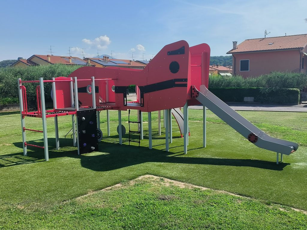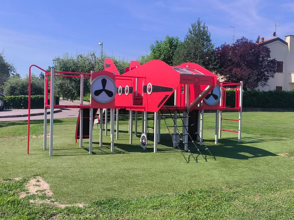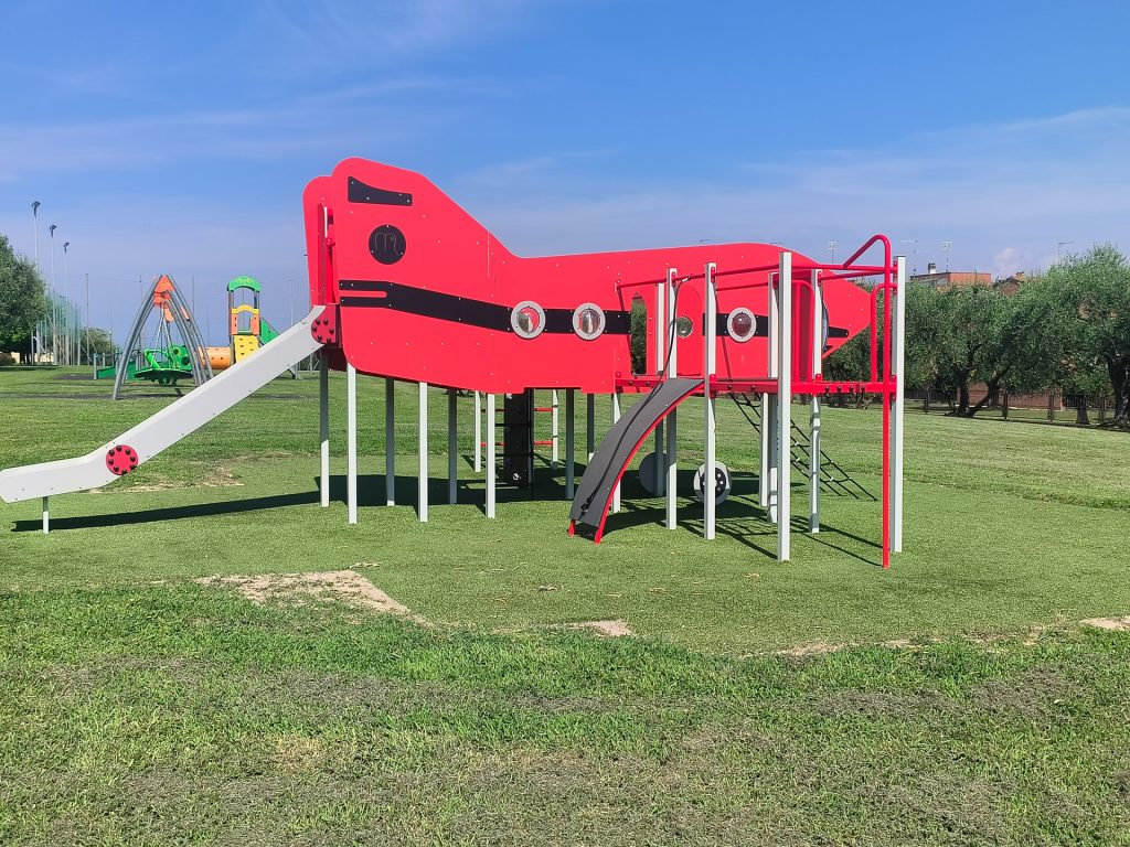 In questo caso il cliente commissiona la realizzazione di varie aree tematiche, ognuna con strutture ludiche dedicate e che ben si conformano all’ambiente circostante. Ove la norma lo prevede è stata realizzata un’area antitrauma in erba sintetica con tappetino di assorbimento d’urto, scelta che permette la creazione di un’area che si integra con le aree esterne, senza stonare. Le strutture sono scelte in base alla fruibilità ed alla fascia di età di utilizzo: strutture più grandi e complesse nei parchi pubblici, giochi bassi ed incentrati al gioco di fantasia per le aree scolastiche. In certe aree l’installazione di strutture più piccole e contenute è stata dettata da necessità di contenere lo sviluppo nello spazio pur mantenendo il fattore ludico. Dove lo spazio lo permette, invece, sono state installate strutture a più ampio respiro come ad esempio l’aereo con arrampicate e scivoli o le strutture a forma di mostro.